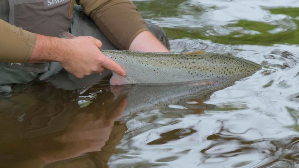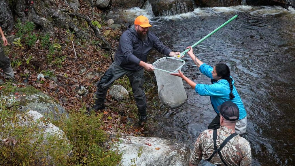 Penobscot Nation Department of Natural Resources staff releasing Atlantic Salmon into Penobscot Nation waters. Still by Josh Woodbury/Sunlight Media Collective.